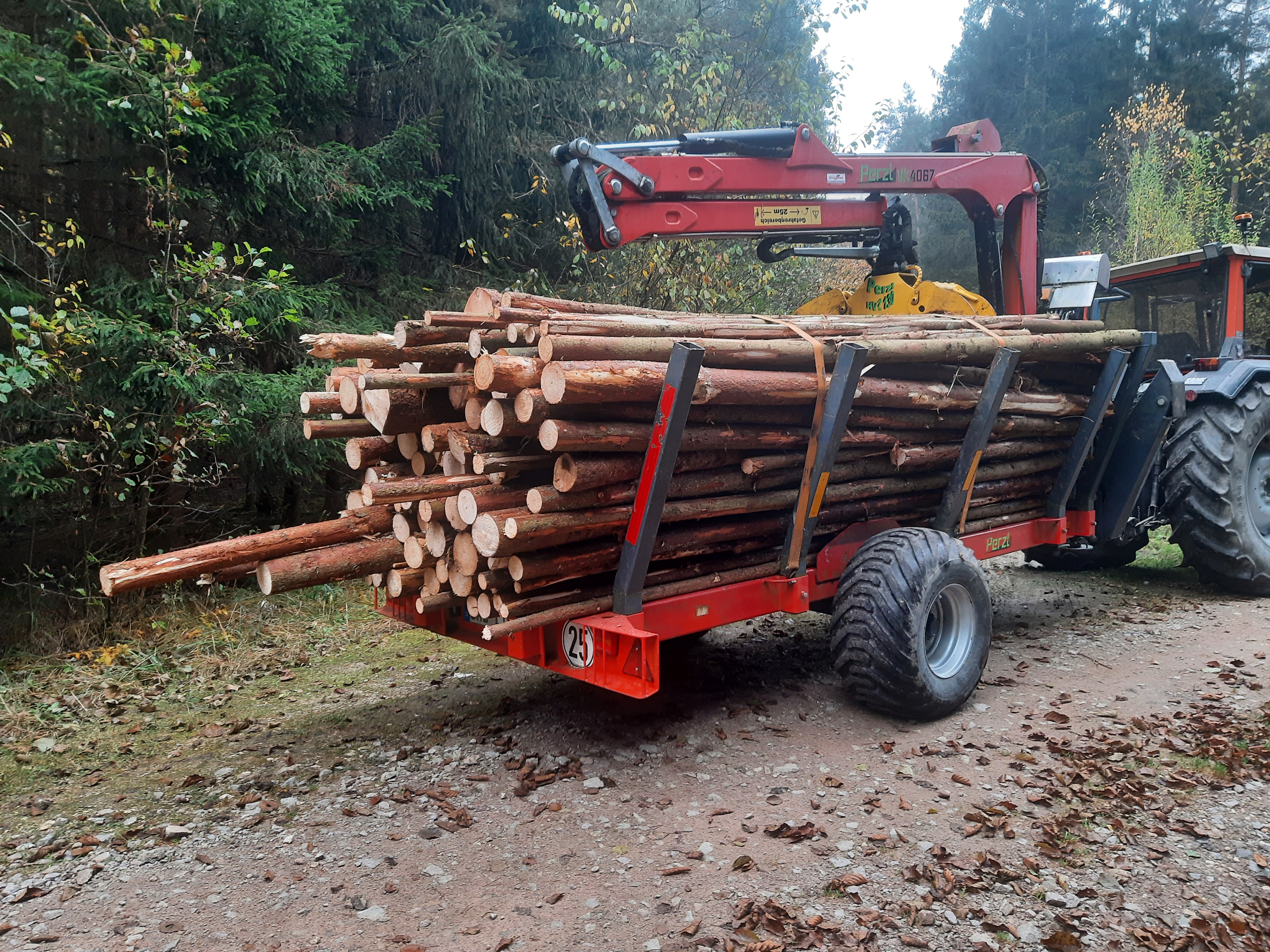 Rückewagen Perzl mit 6,7m Kran sowohl zum Transport von Stammholz als auch zum Transport von 1m Bündeln.